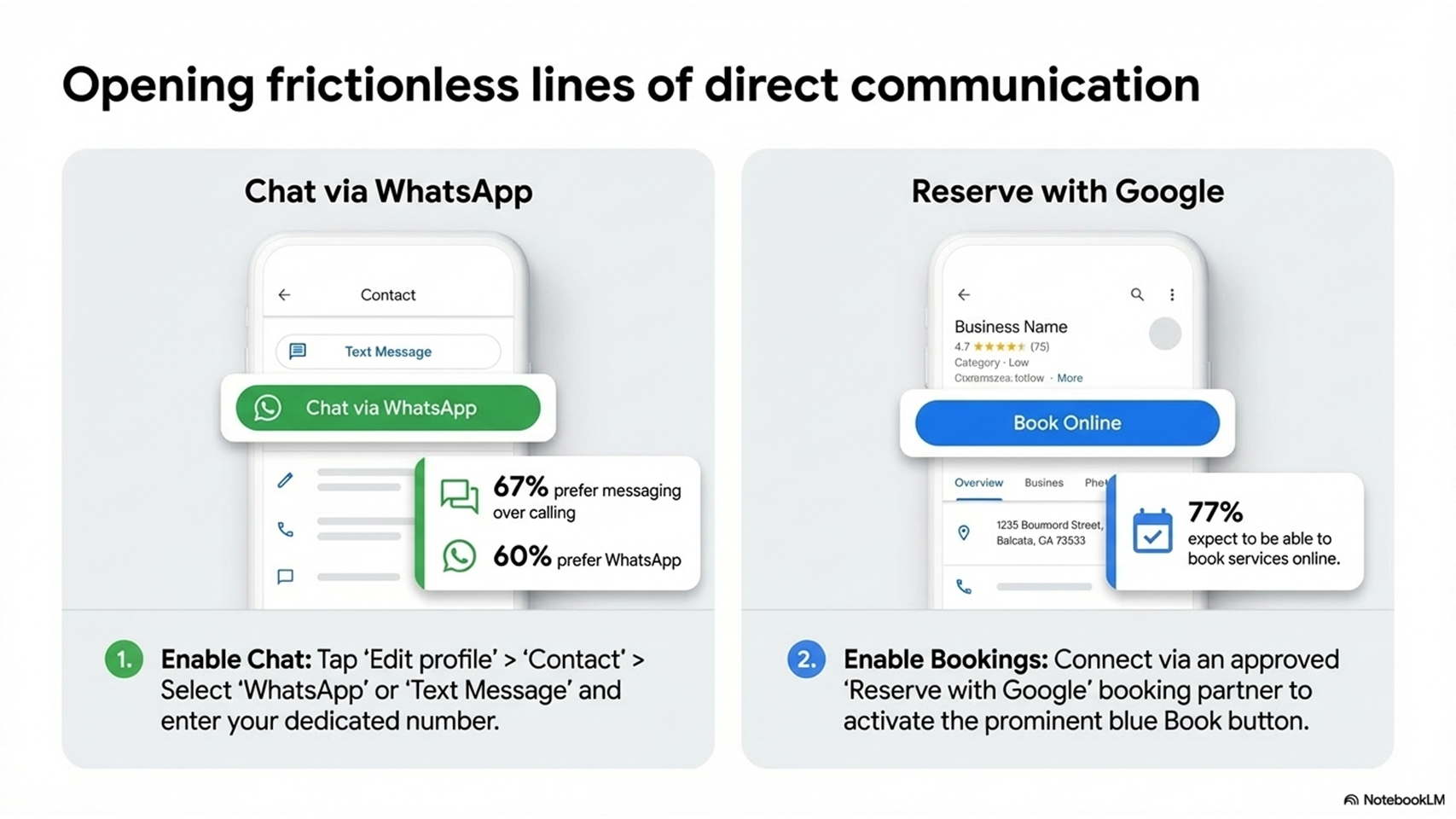 77% of consumers expect to be able to book services online. A booking link directly on your listing meets that expectation without making them hunt for your website.