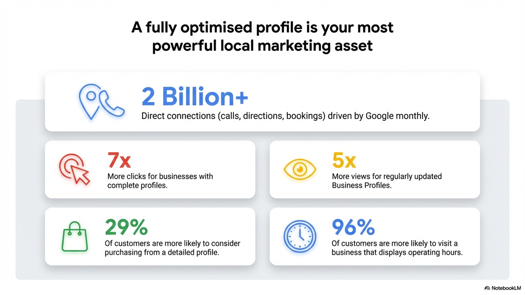 According to Google's own internal data, businesses with complete listings receive 7x more clicks than those with incomplete profiles. Profiles that are regularly updated get 5x more views. And 29% of customers say they're more likely to consider a purchase from a business with a detailed profile.