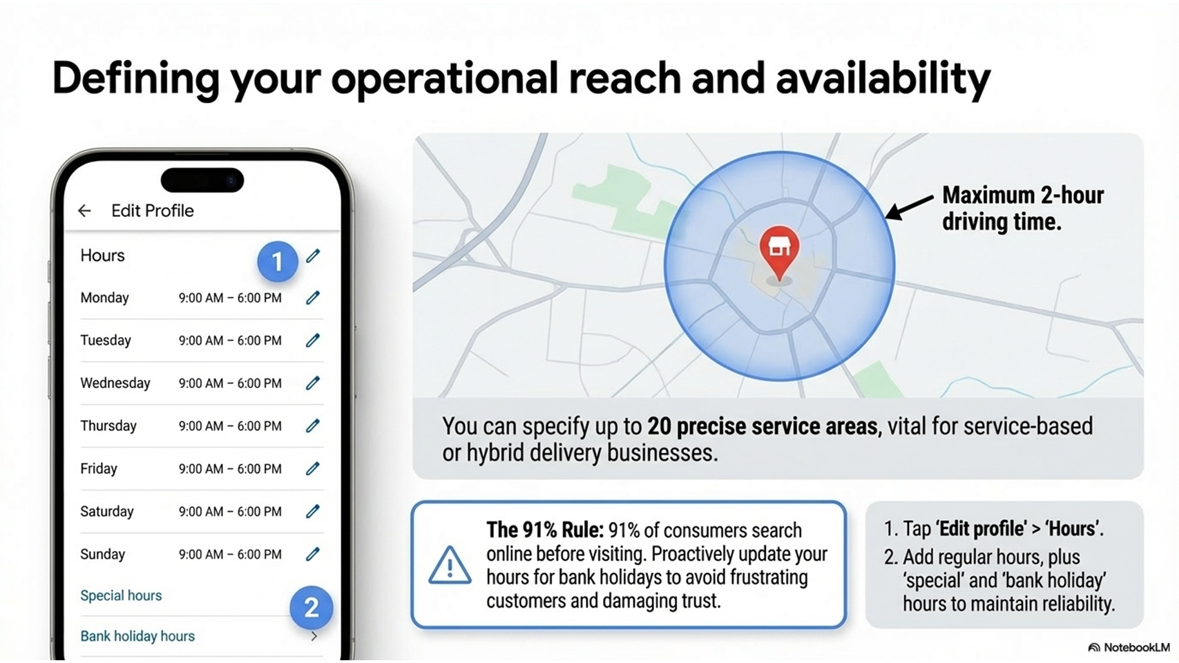 Service-area businesses can list up to 20 service areas on their profile. Google recommends keeping the total coverage within roughly two hours' driving time from your base.