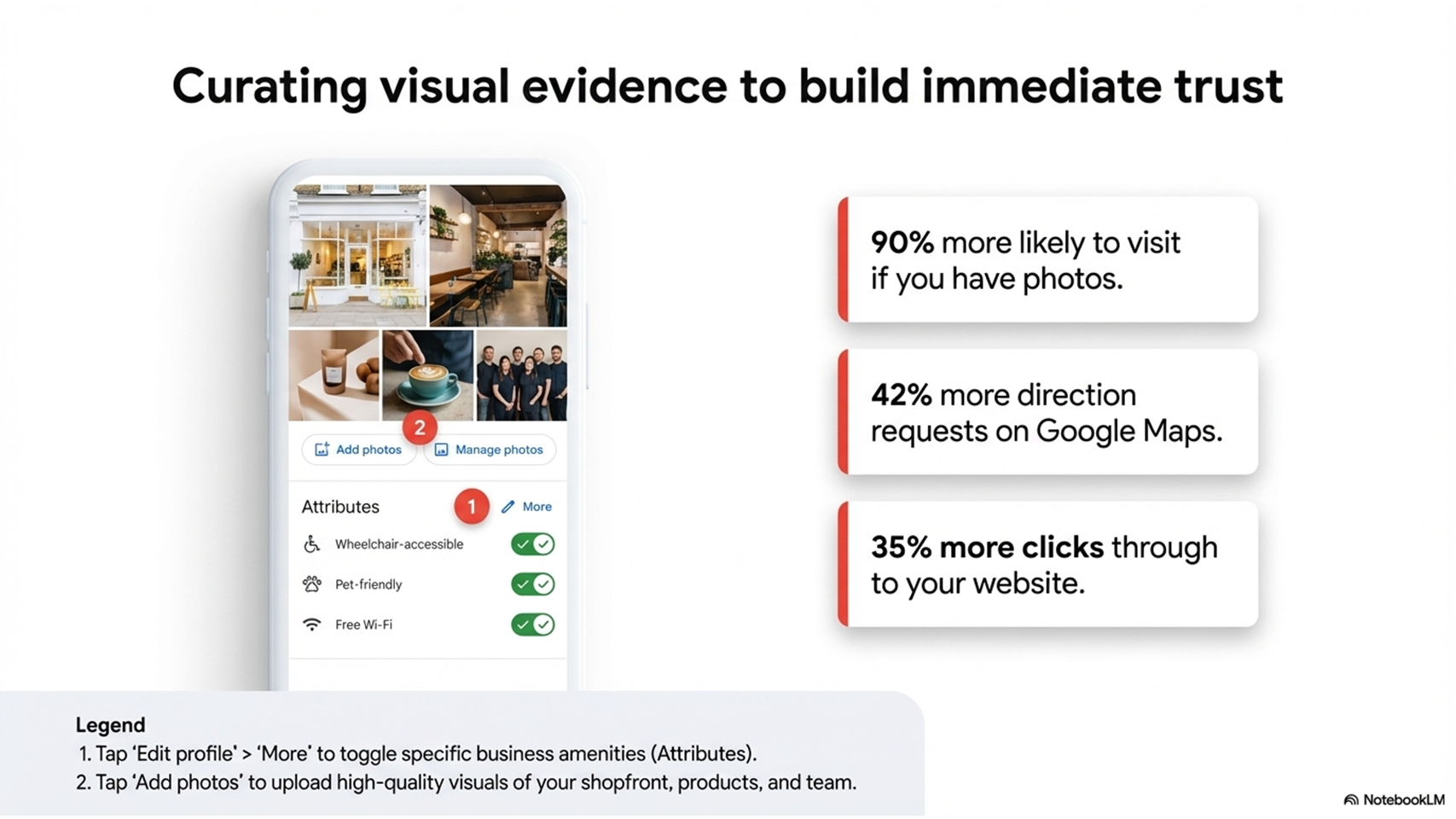 Businesses that add photos to their listing receive 42% more requests for directions on Google Maps, 35% more website clicks, and 90% of people say they're more likely to visit a business that has photos on Google Search and Maps.